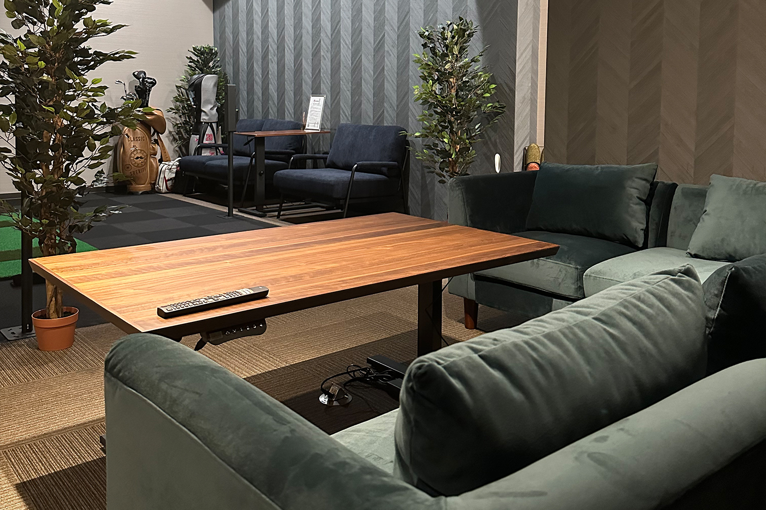 シミュレーションゴルフ設備の隣には、ラグジュアリーなリラックススペースをご用意しています。一人で練習をした後、動画を再確認しながらのんびりくつろぐ。そんな時間も大切にしています。