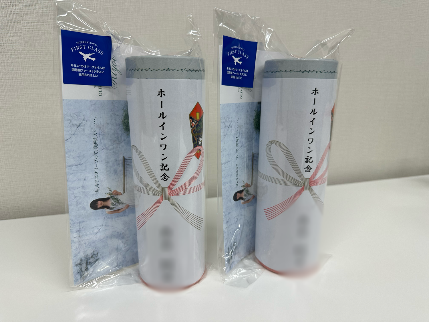 会員様から「渡したいものがある」とご連絡頂き、「何かな?」とドキドキまっていると、「ここで練習してるおかげか、スイングよくなってきてな!んで、こないだホールインワンでたんや!」と嬉しそうに記念品を持ってこられました!