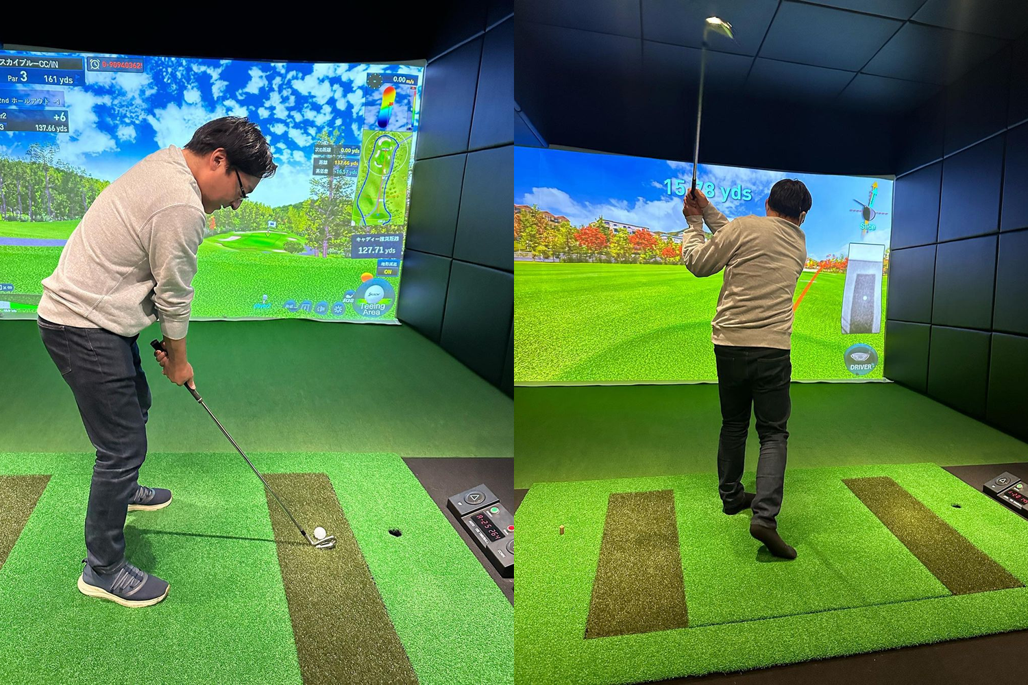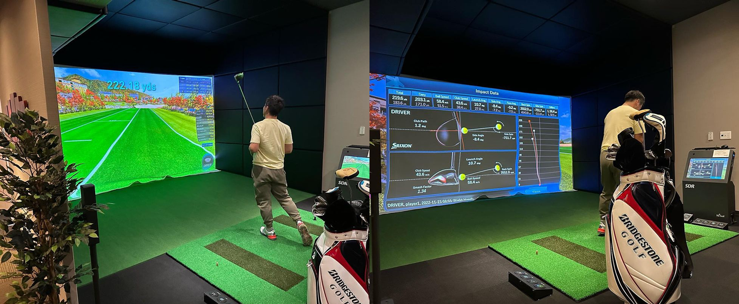 モニターでお子様が動画を見られてる中、ご主人様はシミュレーターでゴルフの練習。