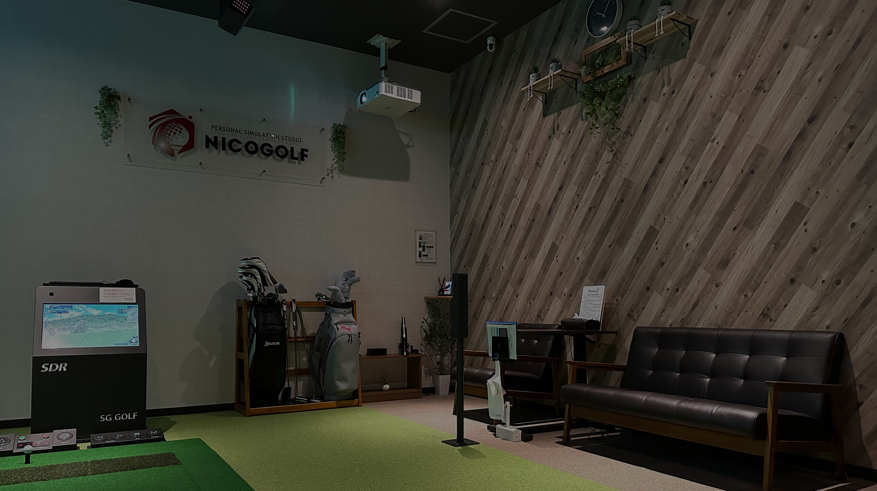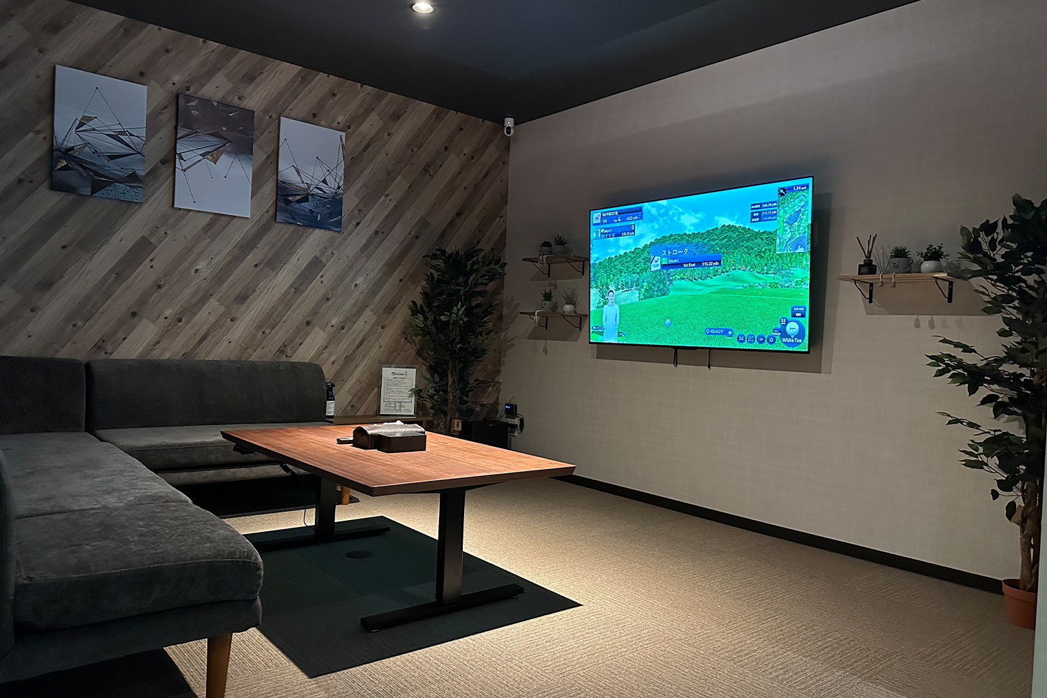 シミュレーションゴルフ設備の隣には、ラグジュアリーなリラックススペースをご用意しています。一人で練習をした後、動画を再確認しながらのんびりくつろぐ。そんな時間も大切にしています。